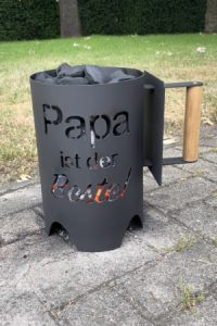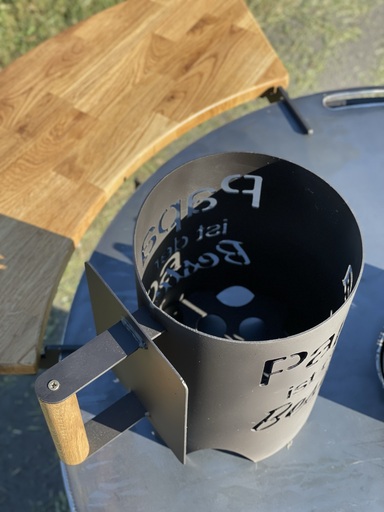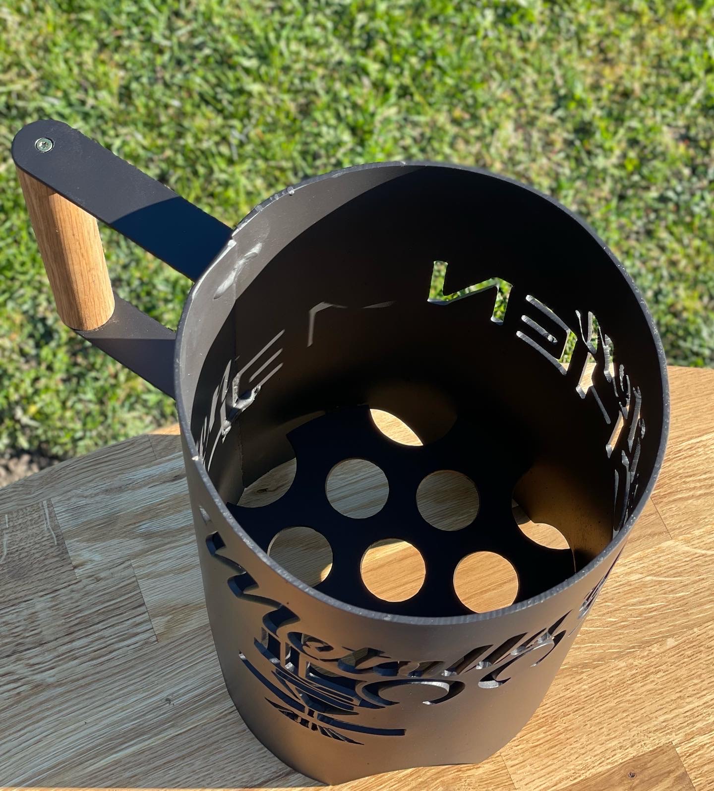 Der Anzündkamin hat eine Höhe von 300 und einen Durchmesser von 200mm. Das 2mm dicke Material ist mit feuerfeste Farbe beschichtet und hat einen Griff aus Eiche-Rundholz.